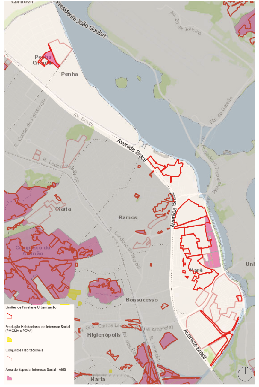 Al comparar con la información de la Tabla 2, los conjuntos habitacionales aparecen como islas en el sur del complejo. Especialmente la parte sur de la región (Vila do João, Vila dos Pinheiros, Conjunto Habitacional dos Pinheiros, Conjunto Bento Ribeiro Dantas, Salsa e Merengue), que fue la más impactada por la política habitacional, estando prácticamente toda constituida por conjuntos.