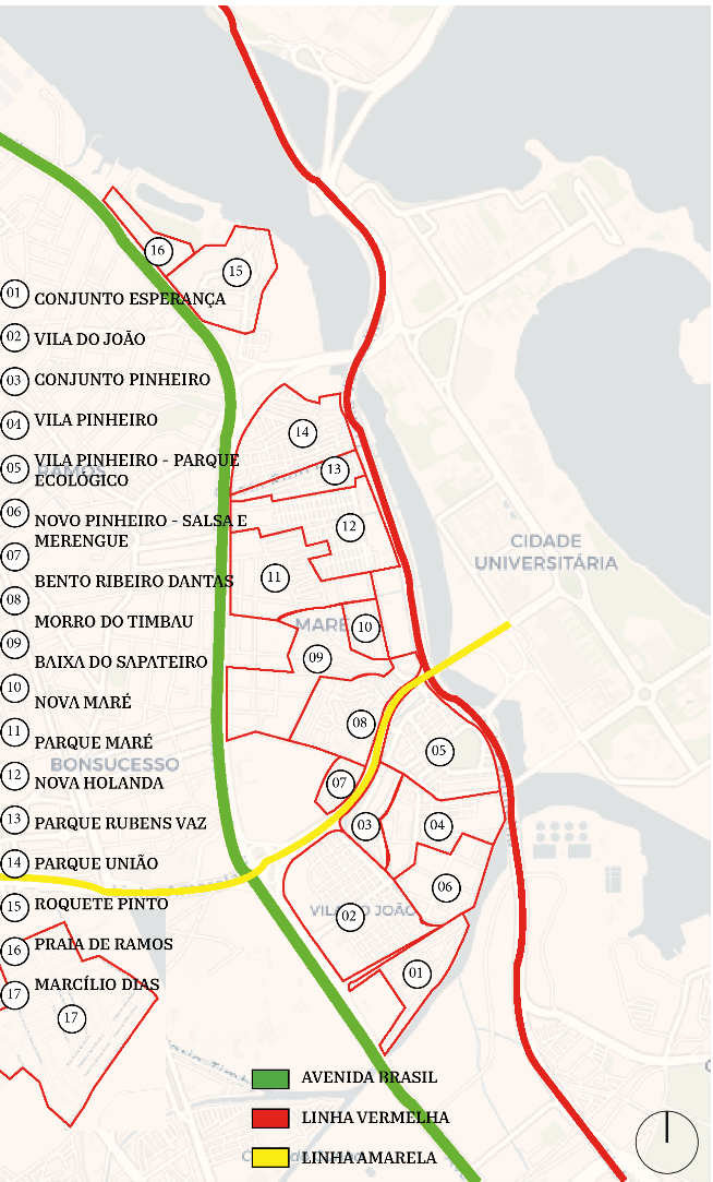 Esta discusión fue adaptada de un trabajo más amplio que involucra un proyecto urbano. Dicho proyecto fue idealizado para el territorio del Complejo de la Maré y sus alrededores, y desarrollado en medio de la pandemia del Coronavirus, lo que afectó directamente algunos análisis, como el diagnóstico territorial, por ejemplo. Por ello, la organización no gubernamental Redes de Desarrollo de la Maré fue imprescindible para el estudio. Sus publicaciones proporcionaron datos más detallados sobre las favelas del barrio, especialmente el Censo Poblacional de la Maré, pero también boletines informativos, testimonios de residentes e historias orales sobre la formación del barrio.