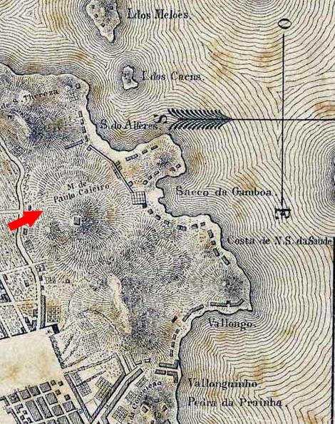 In order to avoid the proliferation of batteries along the Saco da Gamboa and Alferes areas and the expenses they would entail, it was decided that two armed vessels, positioned at the time between Morro da Saúde and Ilha das Pombas (now Ilha de Santa Bárbara), would defend the entrance to the aforementioned inlets. ‘However, these must always be protected by the fortification intended to be built on the summit of Monte de Paulo da Caieira – a place of great advantage, as it commands the aforementioned inlets to its north, and also commands, from west to south, Mata Porcos (Caminho do Mata Porcos, now Rua Estácio de Sá), the road that leads to the city, and part of the Campo de Santana; and from south to east to north it commands the rest of Campo de Santana, a large portion of the city, and the Fortaleza da Conceição.’ (Antunes, 1957, p. 17)