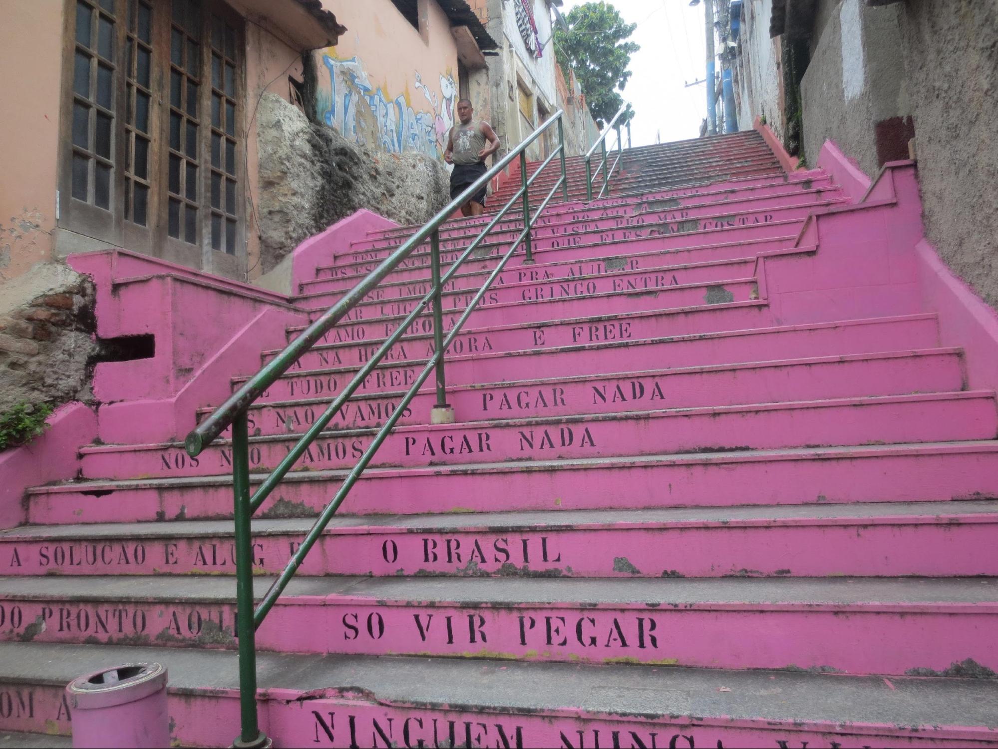 Figure 5: Staircase on Barroso Slope leading to Providência Hill in 2016, then painted pink and featuring lyrics from Raul Seixas’ song Aluga-se (“We won’t pay anything…”).