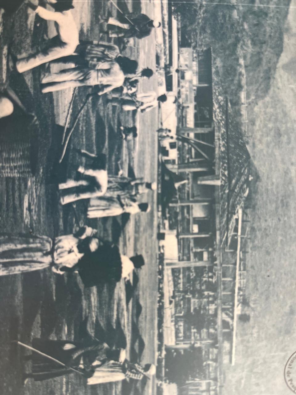 Figure 3: Workers disembark at Marambaia for bridge construction; Port House is visible in the background.