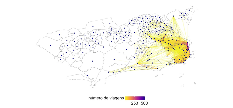 Además de tener el mayor flujo interno, el Centro de la ciudad también es el principal destino de los flujos que parten de otras áreas. La Figura 7 ilustra esta información al representar los flujos origen-destino con más viajes (más de 11) entre las áreas. Los puntos representan el centro de cada área. Esta información se complementa con la Tabla 2, que muestra los 10 principales flujos. Entre ellos, se nota, ya sea como origen o destino, la ausencia del área de Barra da Tijuca que, como se informó, está entre aquellas con mayor flujo interno.