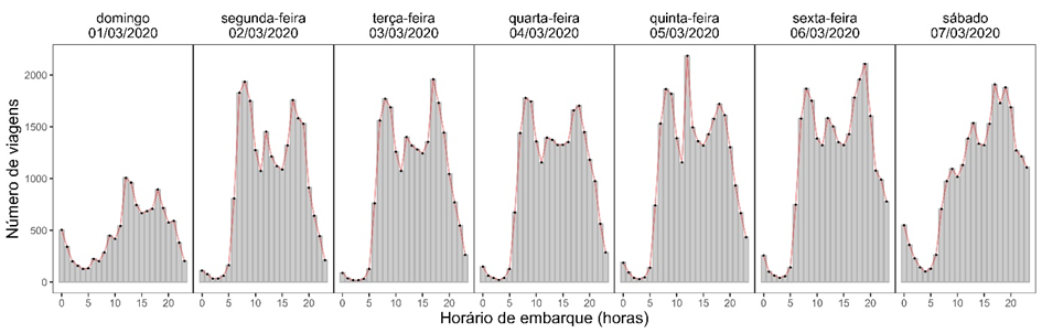 Durante el fin de semana, los dos picos característicos no son tan evidentes, lo que puede sugerir que los desplazamientos no están determinados por los motivos predominantes entre semana. Esta constatación refuerza la configuración de una movilidad cotidiana menos asociada al trabajo como motivación. El sábado, el comportamiento se caracteriza por un aumento en el número de embarques a lo largo del día, con dos picos más evidentes: uno a la mitad y otro al final de la tarde. Se trata de un comportamiento no registrado en estudios sobre otras ciudades, sugiriendo una situación específica de la ciudad de Río de Janeiro. El domingo, día con menor volumen de registros, los dos horarios con mayor número de viajes son alrededor del mediodía, probablemente cuando las personas buscan algún restaurante para almorzar o incluso van a almorzar a casa de familiares. Además, se detectó un mayor movimiento al final de la tarde, cuando probablemente las personas están regresando de actividades realizadas durante el día.