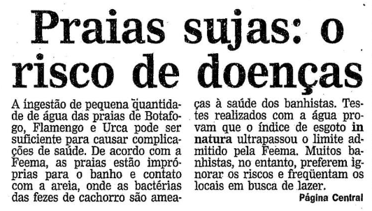 Na edição de 28 de julho de 1987, O Globo denunciou a péssima qualidade da Praia do Flamengo. O jornal comunica a importância de não banhar-se nas praias da Baía de Guanabara devido às insalubres condições de balneabilidade. A Feema, em trabalho conjunto da Cedae, alertou os altos índices de coliformes e a nocividade à vida humana acarretada pela pequena ingestão dessas águas. Na reportagem, frequentadores e trabalhadores da Praia do Flamengo relatam a visibilidade de fezes, detritos, peixes mortos e areias escuras, além do mau cheiro na tradicional praia carioca.
