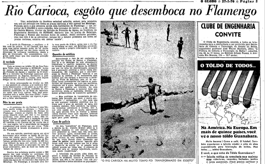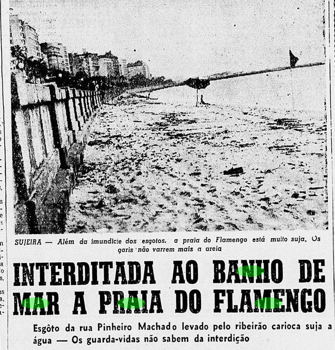 En los acervos de periódicos, los primeros indicios de una contaminación más severa ocurrieron a partir de la década de 1950. En un primer caso, de 1957, hay información de una ruptura en una galería de alcantarillado en la Calle Pinheiro Machado (Laranjeiras). En este caso, el Departamento de Alcantarillados del gobierno del estado sugirió el desvío del alcantarillado in natura directo al Rio Carioca, que desaguaba en la Playa de Flamengo. Esta medida generó condición impropia para el baño hasta que fuera reparada la galería de alcantarillado rota. El salvavidas entrevistado en ese reportaje afirmó que no fue comunicado de la medida tomada por las autoridades y relató que si se hubiera enterado de lo ocurrido, aconsejaría a los bañistas no permanecer en el mar. El periódico Diário da Noite, responsable de la noticia, aún afirmó que la Playa de Flamengo era una región muy concurrida y que la Secretaría de Salud debía colocar avisos de balneabilidad impropia en los accesos a la playa.
