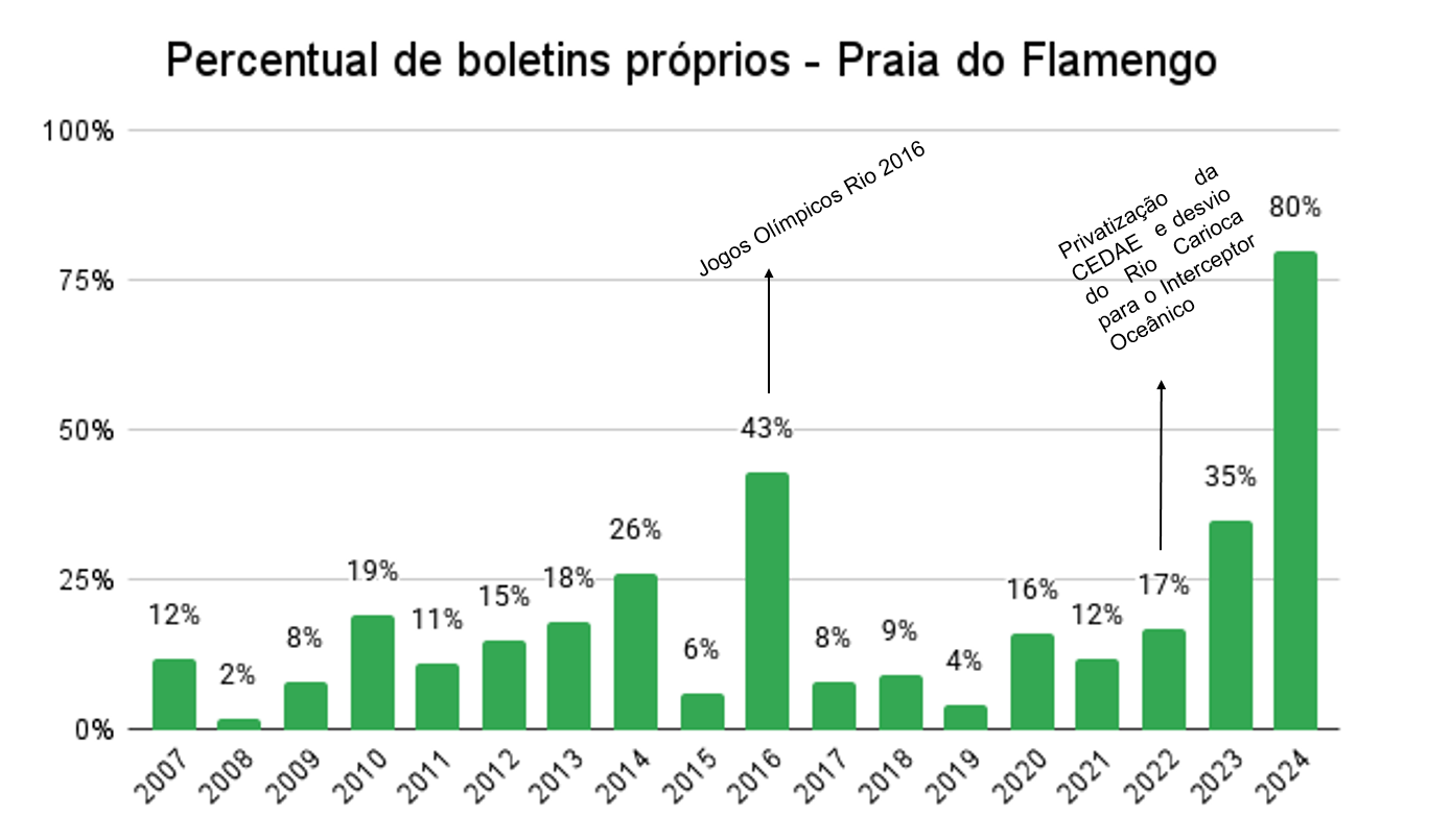 la Playa de Flamengo vio, en raros momentos, su balneabilidad clasificada como propia. Estas ocasiones, casi que especiales, se dieron, probablemente, debido a la necesidad de una mejora inmediata y puntual de la calidad de su agua, como ocurrió en los Juegos Olímpicos de 2016. En este período, se observó la mejora brusca en los boletines de balneabilidad del INEA y, también, un empeoramiento acentuado en el año siguiente a las Olimpíadas; evidenciando: una descontinuidad en el plan de descontaminación de la Playa de Flamengo y de la Bahía de Guanabara; y el interés en dejar la balneabilidad propia solamente en los meses próximos a agosto de 2016, cuando el evento deportivo ocurrió en la ciudad.