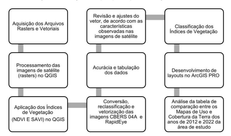 Considering the diversity of procedures adopted and the inherent complexity of the environmental dynamics in Vargem Grande, it is relevant to justify the choice of tools employed. Faced with this complexity, especially in an interface area between urban expansion and conservation units, the methodology required the use of high-precision instruments with analytical capability. In this sense, Remote Sensing (RS), Digital Image Processing (DIP), and Geographic Information Systems (GIS) were mobilized as the essential technological triad for capturing, processing, and analyzing land use and cover changes over the study period (2012–2022). Such geotechnologies allowed not only for the quantification of changes but also for the detailed investigation of specific indicators of vegetation health and vigor, providing the basis for a precise understanding of socio-environmental pressures on the territory.