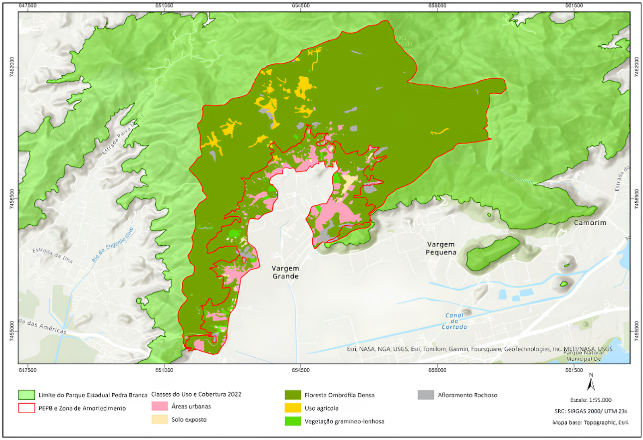 In this context of accelerated urbanization and real estate speculation, the situation in Vargem Grande became particularly concerning due to the presence of the Pedra Branca State Park (PEPB), one of the largest Atlantic Forest conservation units in Brazil, located on its boundary. Recognized as one of the largest urban forests in the world and the largest in the country, the PEPB covers approximately 58% of the neighborhood's area and is extremely important for the hydrological and climatic balance of the city of Rio de Janeiro (Turetta et al., 2023).