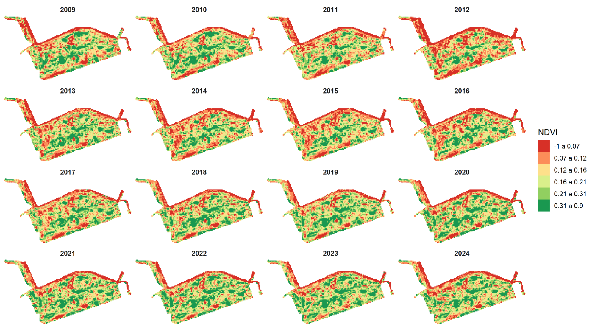 Figura 3: Distribuição espacial do índice NDVI na AEIU Porto Maravilha (2009-2024).