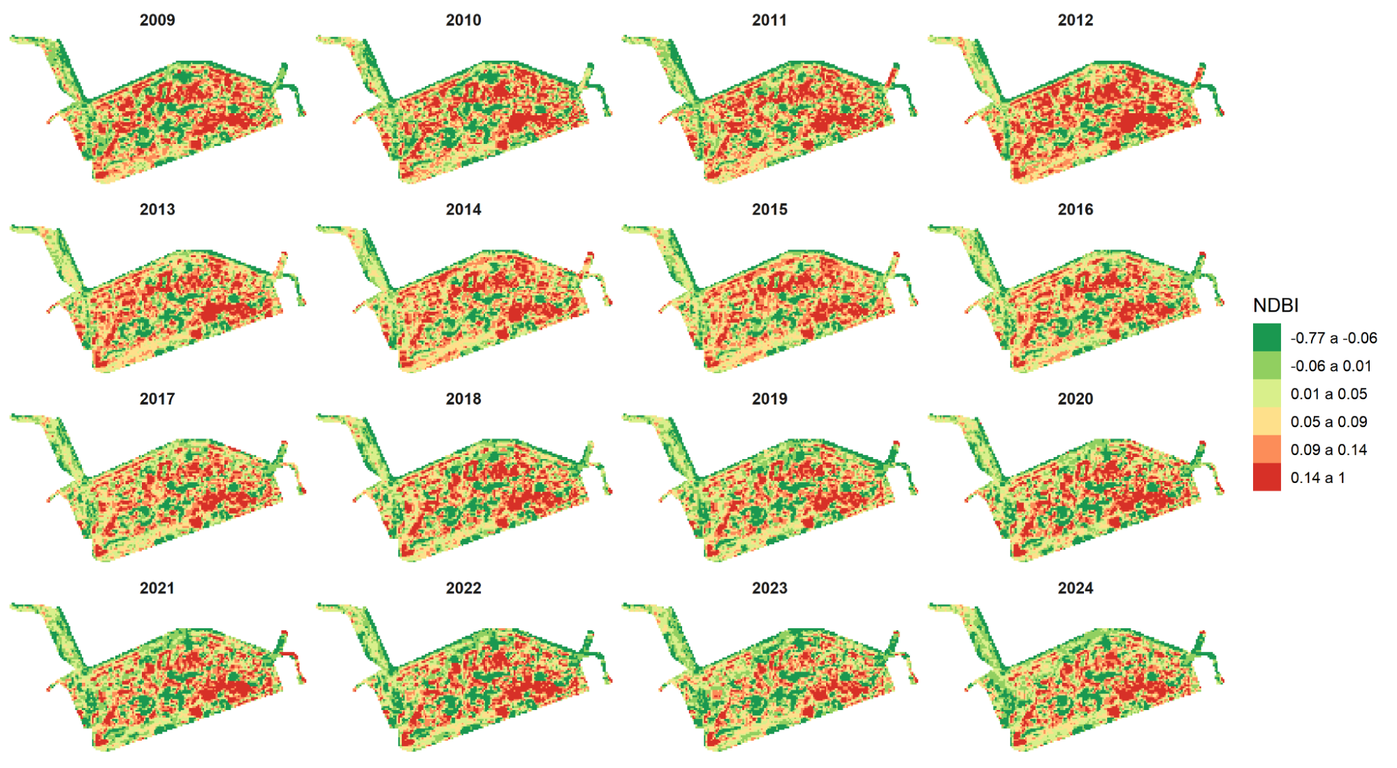 Figura 4: Distribuição espacial do índice NDBI na AEIU Porto Maravilha (2009-2024).