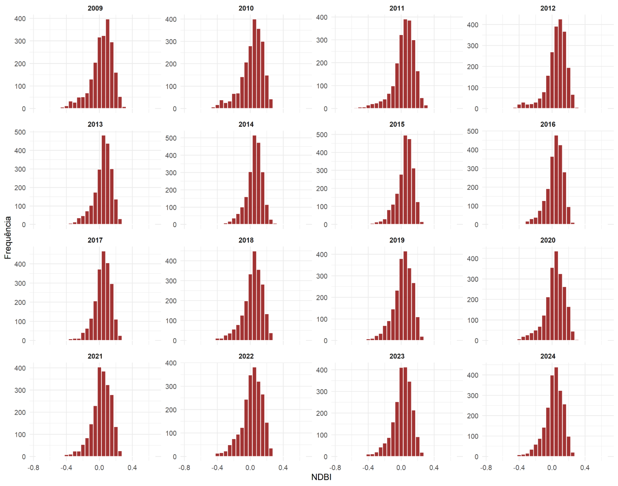 A Figura 5 apresenta o histograma da distribuição dos pixels para o índice NDBI. A maior concentração de valores ocorreu próximo a zero, na faixa de (0 e 0,20). Notou-se um deslocamento e aumento das barras ao longo dos anos para os valores mais positivos, à direita, até um determinado ponto em que há também aumento novamente dos valores entre (-0,20 e 0) sugerindo a estabilização da cobertura dessas áreas.