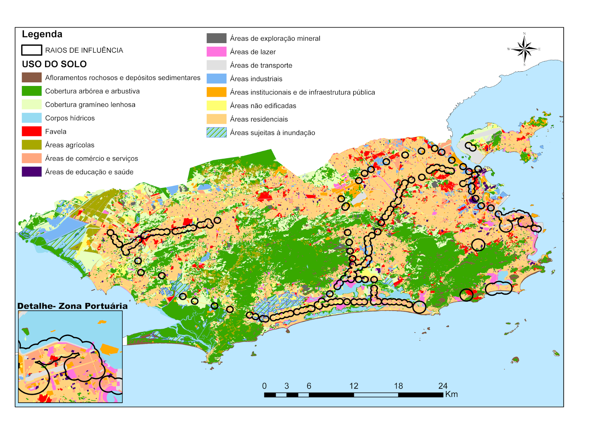 A análise baseou-se em três conjuntos de dados: uso e ocupação do solo, rede e estações de metrô, BRT e VLT com as respectivas demandas de passageiros. Todos os dados foram tratados em ambiente SIG, com a adoção do sistema de referência SIRGAS 2000: