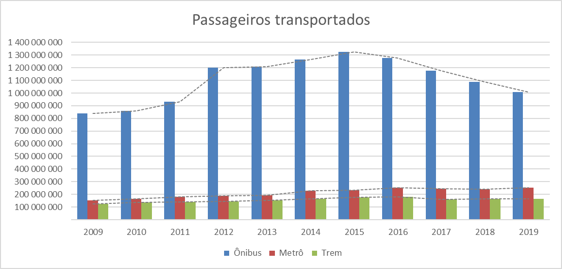 Observou-se aumento acumulado na demanda até 2015-2016: cerca de 50% nos ônibus, 53% no metrô e 37% no trem. Posteriormente, registrou-se queda de 27% nos ônibus (2015-2019), 0,79% no metrô (2016-2019) e 9% no trem (2016-2019). Esta inflexão coincide com o período pós-megaeventos e início da crise econômica estadual, evidenciando a relação entre atividade econômica e uso do sistema de transporte. A Figura 4 apresenta o total de passageiros transportados por transportes terrestres na cidade.