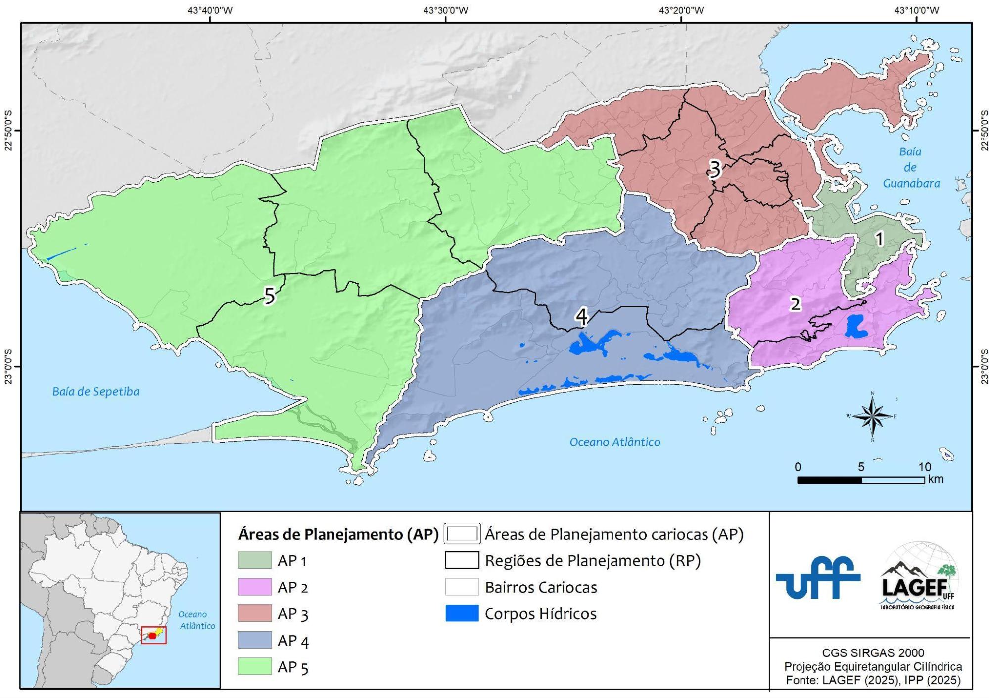 O município está dividido em cinco Áreas de Planejamento (APs): a AP-1, correspondente ao Centro; a AP-2, que abrange a Zona Sul e a Tijuca; a AP-3, composta por Ramos, Méier, Madureira, Inhaúma, Penha, Pavuna e Ilha do Governador; a AP-4, que inclui Jacarepaguá e Barra da Tijuca; e a AP-5, formada por Bangu, Campo Grande, Santa Cruz e Guaratiba (Tabela 1).