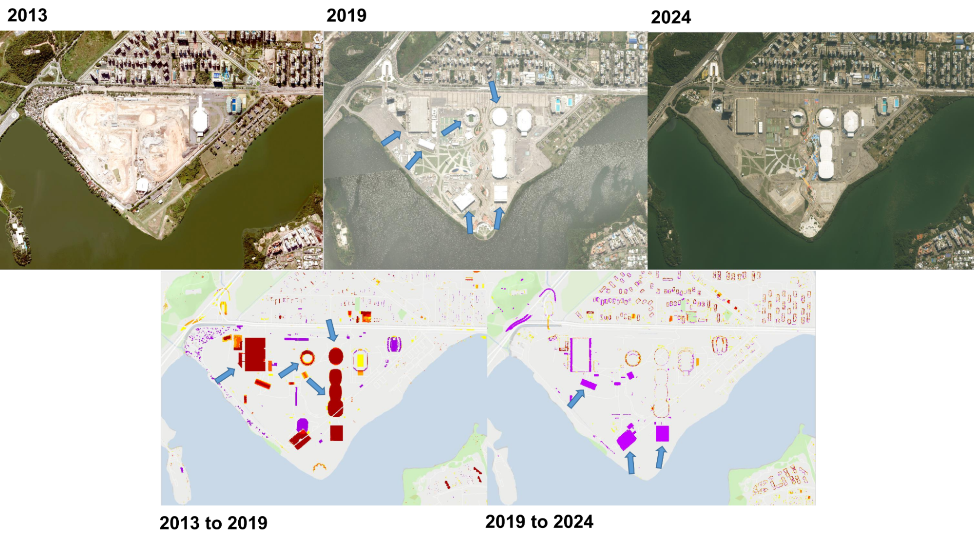 Figure 20: Changes in the Olympic Park area. Visual inspection shows that the methodology was able to capture structures built for the 2016 games and, again, the demolition of some temporary structures between 2019 and 2024. Other features include the forced eviction of Vila Autódromo (NW corner) and construction of new condos in the northern half of the area.