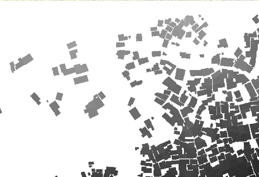 This 3D multipatch was then converted to a raster format with a spatial resolution of 0.5 m per pixel, resulting in a building elevation model (Figure 10). This resolution was selected to balance city-wide processing efficiency with the need to resolve individual buildings accurately.