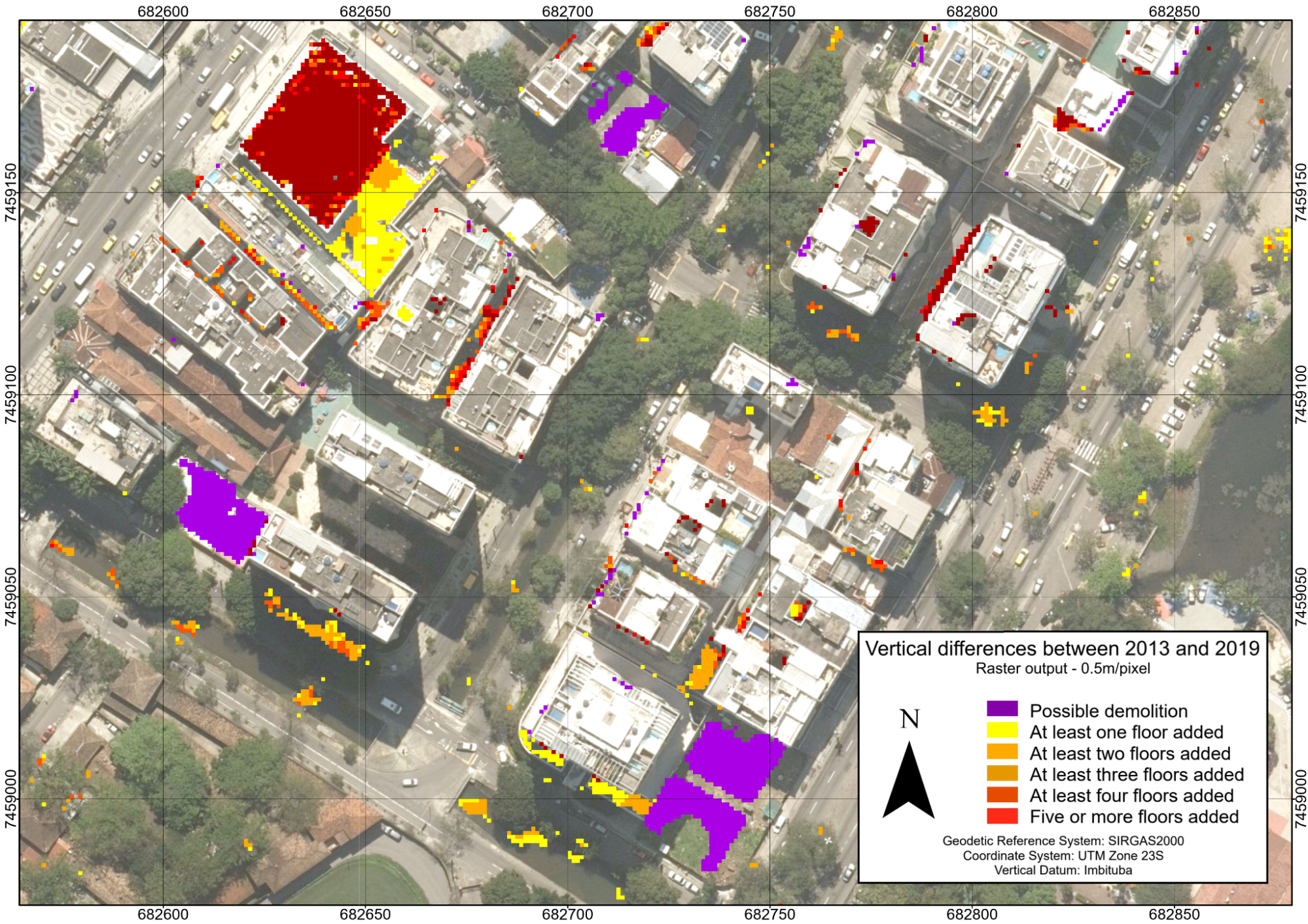 Results show a strong trend of vertical growth in the city of Rio de Janeiro, given the fact the addition in area and volume considerably outpaces the expansion in terms of building footprints. As already discussed in 4.1, it is not advisable to use summary data to infer any specific trends in terms of building activity (such as estimates for new residential units added), due to the many uncertainties involved in the process. Nevertheless, the fact that visual validation has proven consistent with changes in orthoimages shows that general, city-wide estimates may be conducted with the data obtained in this study. And finally, these same data can still be used for monitoring both legal and illegal construction, thus providing a screening tool that could be used in conjunction with other measures (such as consulting permits and localized aerial surveys).