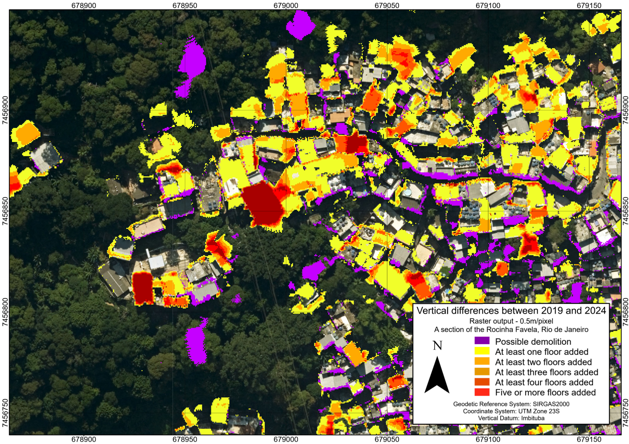 The raster data provides a consistent methodology to monitor vertical growth across the entire urban fabric. As shown in Figures 16 and 17, it is effective at detecting informal, incremental construction in favelas. On the other hand, it can also be used to capture large-scale development in formal city districts. This capability allows municipal authorities to move beyond fragmented reporting and maintain a holistic, current understanding of urban development dynamics, which is fundamental for effective infrastructure planning and service provision.