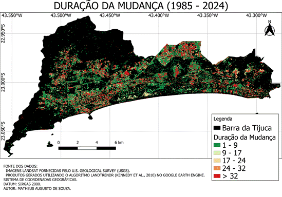 A análise da duração das mudanças para a área da Barra da Tijuca, visualizada no mapeamento da Figura 6, indicou padrões complexos. Observou-se uma concentração de mudanças com durações entre 1 e 9 anos, o que pode representar eventos de supressão de vegetação que se concluem e se estabilizam em um novo tipo de cobertura (como solo exposto ou o início de uma construção) dentro desse intervalo.