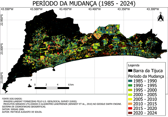 Considerando este contexto, o objetivo do presente estudo consistiu em analisar as mudanças de uso e cobertura do solo na Barra da Tijuca, entre os anos de 1984 e 2024, por meio do algoritmo LandTrendr. A pesquisa busca quantificar e mapear a perda de áreas vegetadas em decorrência da expansão urbana, validando os resultados por meio de matriz de erro e métricas de acurácia, para garantir a precisão na detecção das mudanças mapeadas.