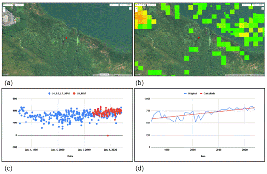Figura 7: Exemplo de Erro de Comissão (Falso Positivo). (a) Imagem em cor verdadeira com o ponto de referência. (b) Classificação do LT. (c) Série histórica do índice NDVI para Landsat 4, 5, 7 e 8. (d) Série temporal da classificação do LT, com queda no segundo segmento.