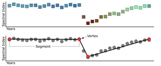 Figura 3. Segmentación de series temporales de píxeles de LandTrendr. Los datos de la imagen se reducen a una sola banda o índice espectral y luego se dividen en una serie de segmentos de líneas rectas mediante la identificación de puntos de interrupción (vértices).