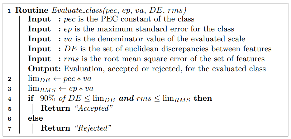 The option to display results for all scales provided by the BSM differs mainly by diverting to an execution loop that determines the accepted class for each scale in the BSM (Figure 3). If a class is approved for a given evaluated scale, the approved class is stored and the remaining classes at the same scale are no longer evaluated. If no class is approved for the evaluated scale, the result “rejected” is stored. Alternatively, when the user wishes to detail the evaluation of classes for a specified scale, the return results (Figure 4) are directly stored for each evaluated class. The metric constants shown in Table 1 and the scale denominator are passed to the evaluation routine as arguments so that any scale can be computed.