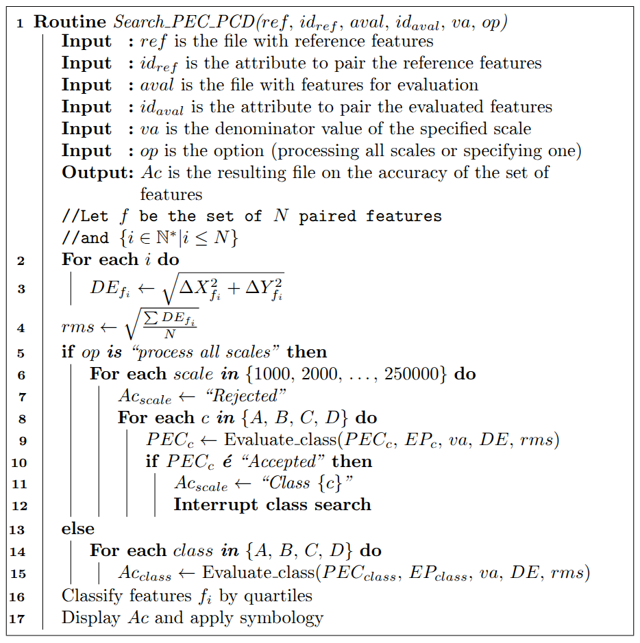 After the selection of homologous features and the grouping of the different samples, the calculation of the PEC-PCD for each of them was based on the development of a plugin in QGIS 3.34.8. This plugin is characterized as an update and improvement of the QPEC toolset (Elias et al., 2023). Regarding the evaluation of positional accuracy of point features, QPEC was based on queries using SQL-like programming language and processes grouped in the QGIS 3.34.8 graphical modeler, so that the script could later be exported. In this context, the data input consisted of inserting reference features and evaluated features, and the result was presented in the attribute table with the minimum PEC-PCD class accepted for each of the Brazilian Systematic Mapping (BSM) scales (1:1,000, 1:2,000, 1:5,000, 1:10,000, 1:25,000, 1:50,000, 1:100,000, and 1:250,000) (Brasil, 2015, 2018). If, at the evaluated scale, the feature was not accepted in any class, the message “Rejected” was displayed.