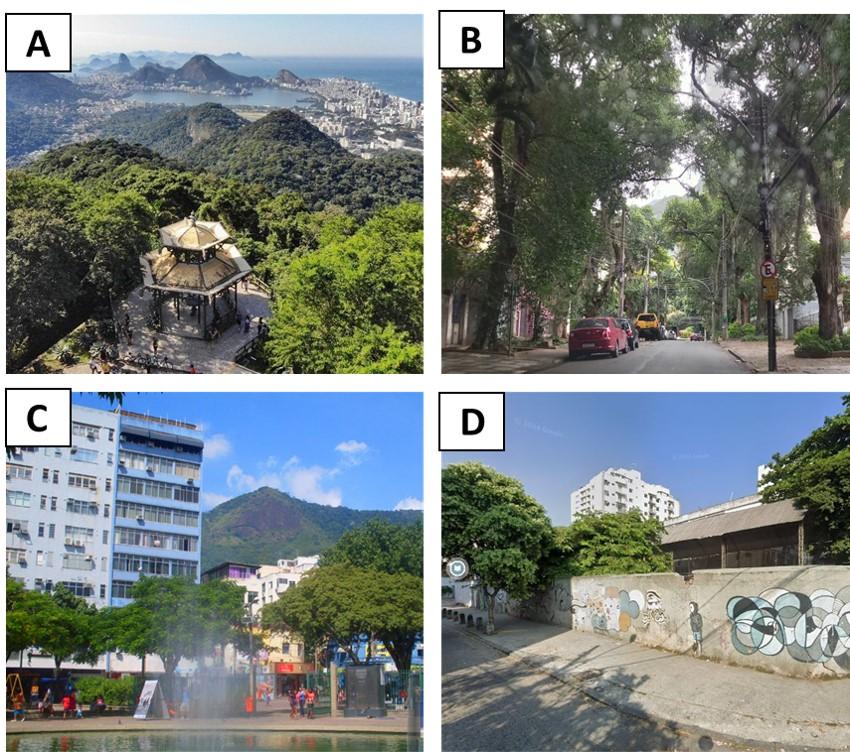 Figure 3a, corresponding to Vista Chinesa in Tijuca National Park, illustrates a large-scale naturalized green system whose function goes beyond recreation, contributing to microclimatic regulation, biodiversity conservation, and ecological connectivity. Figure 3b, on Grajaú Street, exemplifies street tree planting in a densely urbanized environment, highlighting the role of street trees in improving thermal comfort, air quality, and the humanization of urban landscapes. Figure 3c, referring to Saens Peña Square, represents a formal, organized, and planned green space inserted in an area of centrality, reinforcing the social and recreational function of these spaces in everyday urban life. Finally, Figure 3d, from the Francisco Campos Municipal School, highlights the presence of intra-block vegetation, which is important for increasing permeability, reducing heat islands, and diversifying green elements within the urban fabric. Taken together, the images illustrate the breadth and heterogeneity of UGI, showing how different forms of vegetation are integrated into urban space and perform distinct environmental, social, and landscape functions.