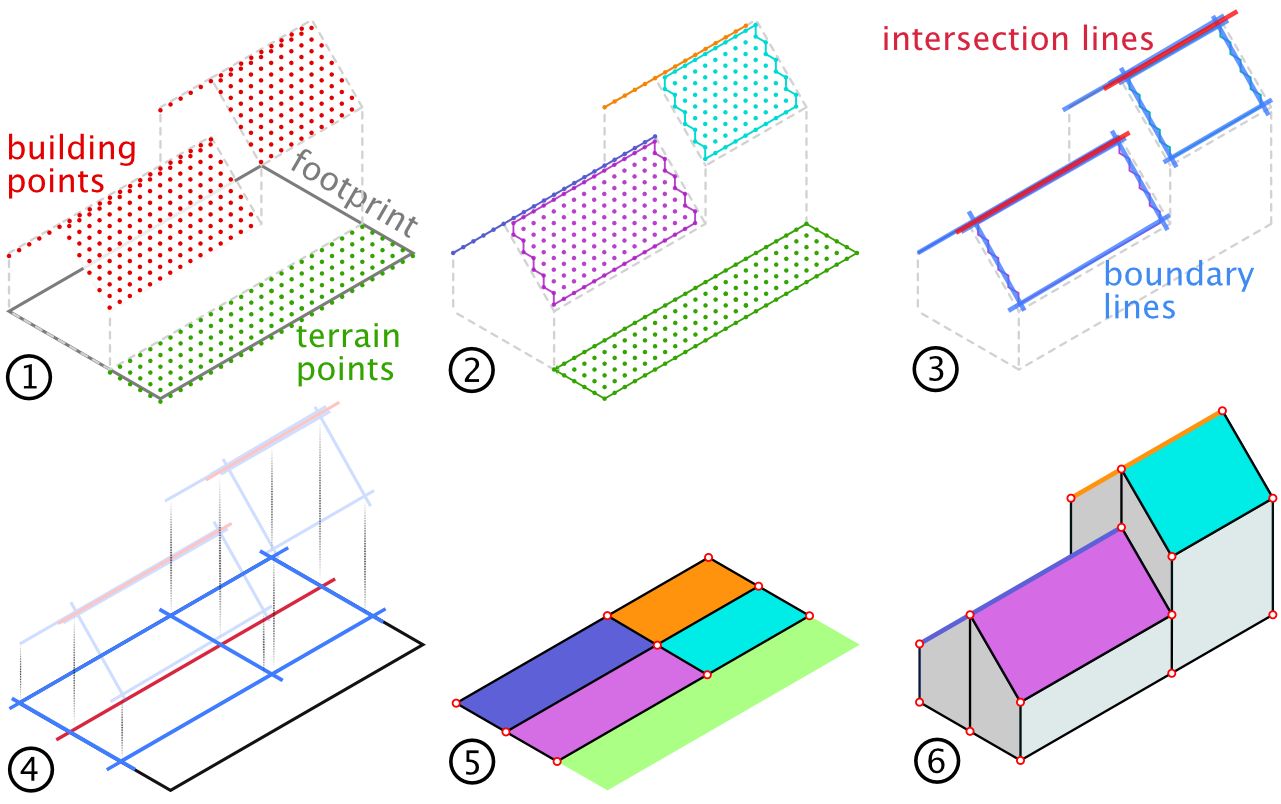 Figure 5: Main processing stages of the reconstruction implemented in roofer: 1) data input; 2) planar primitive detection; 3) linear primitive detection; 4) 2D projected partitioning; 5) optimized partitioning; and 6) vector output after extrusion.