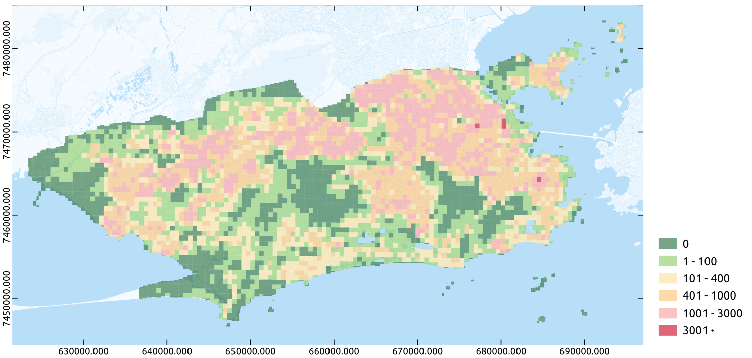 The municipal building cadastre updated based on the dataset surveyed in 2019 comprises just over 1.5 million buildings. Non-geometric attributes (such as single-family or multifamily residential use, commercial or mixed use) fall outside the scope of this study and, to ensure compliance with the General Data Protection Law (LGPD) (Brasil, 2018), anonymized records cannot be linked to other tables. These records include geometries of multiple planar projections to describe different heights of the same observed building. Base and top elevations are assigned to these geometries, which are useful for block extrusion in a model compatible with LoD 1. There is also a field describing typology, in order to organize projections and distinguish functional buildings from constructions under development or ruins. Finally, a building identifier allows the dissolution of projections into a single footprint polygon. Figure 4 illustrates building density (represented by their footprints) on a grid with rectangular cells of up to 550 meters, corresponding to approximately 0.3 km².